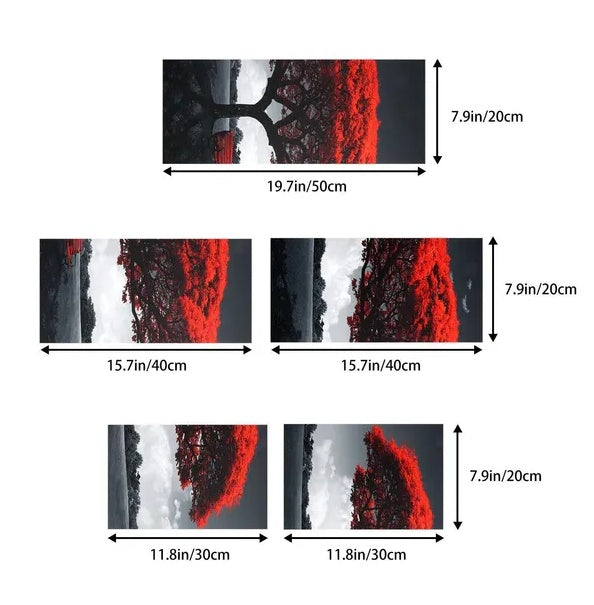 This beautiful 5-piece canvas print features a striking landscape of a red tree that adds a pop of color and a touch of nature to any room. The canvas is made with high-quality material and printed with inkjet technology to ensure sharp and vivid details. This frameless decorative mural consists of five separate panels, each showcasing a part of the artwork, making it an impressive piece of wall art for your living room, bedroom, or office. The canvas set is perfect for creating a modern, stylish, and vibrant atmosphere in your space.